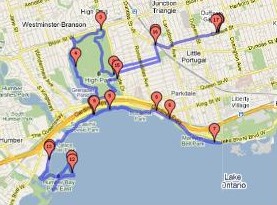 Route description: Start and end point is the West-End YMCA at Dovercourt and College.  Run west to High Park, enter at High Park Boulevard, up Centre Road to a path that circles the park.  Run counter-clockwise on the mainly shaded, wood chip trails and exit the Park at Colbourne Lodge drive.  Short jog south to the Martin Goodman trail and east to the end of Marilyn Bell Park, turn around and head west along the lake, over the Palace Pier bridge, through the butterfly garden.   Enter the spit-like, Humber Bay Park East on the path that goes by the monument that honours the victims of the Air India disaster.  Circle the park and then double back and run the same route to Colbourne Lodge Drive.  Enter High Park and run through the southeast quandant, exiting at High Park Boulevard and returning on the same route for the home stretch.
