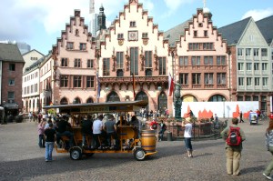 A week ago, we were in Frankfurt, sitting in the main square with my brother, when an unusual sight passed us by; The famous (apparently) beer powered wagon. Well, powered by beer drinkers, that is. My worldly brother and his friends were aware of this wagon-bike, which is like a mobile bar with pedals for each beer drinker. What a sight! It happened too quickly for a photo but I did find these two photos on the internet.