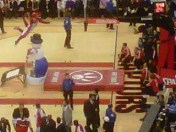 The photo of the Raptor’s mascot was taken with my Blackberry. I just received my camera battery and charger via Fedex this afternoon. It was left behind in our hotel room in San Francisco hence the rather indistinct image of game action.