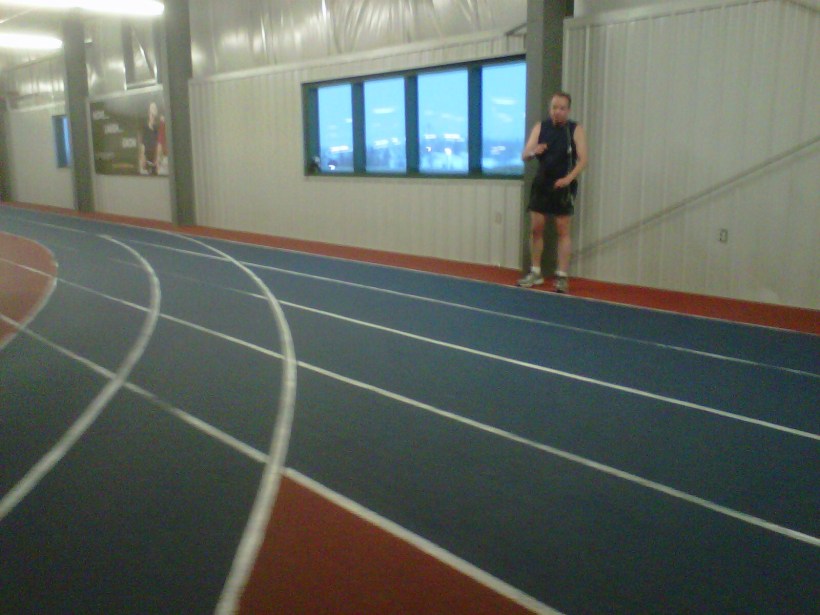 I choose to run on the 250 meter indoor track rather than the treadmill. I had run on this track once before, a couple of summers back, barefoot. The track was deserted, making it easy to give barefoot running a try. Today, I realized upon setting foot on the track, that while too busy to run barefoot, it was to be a far better indoor running experience than the treadmill.