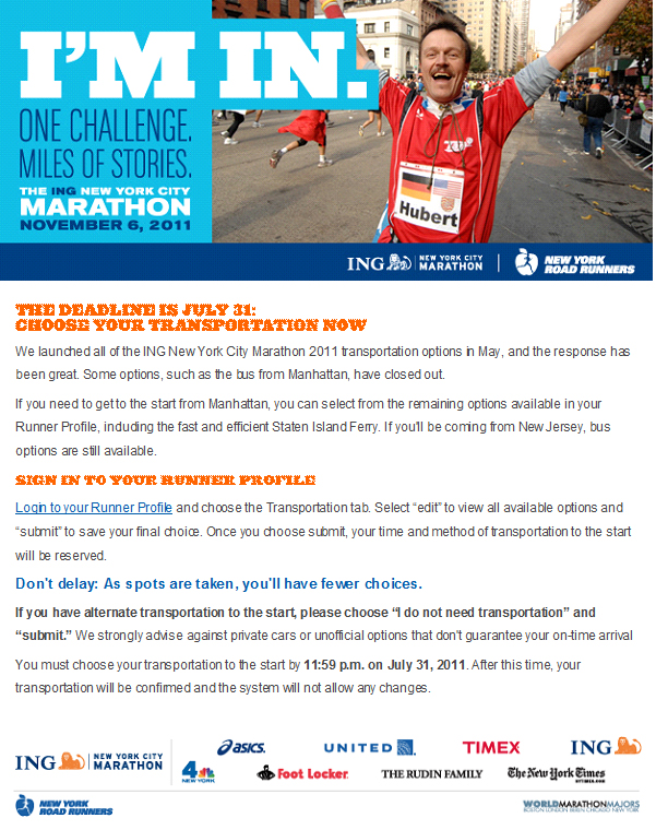 Later in the day I received an email from the NYC marathon telling me that the deadline for choosing transportation to the start line is July31st. Yikes . . . such is the way when you run the mother of mega-city-marathons and I’m already too late for the bus option which loads a block away from my hotel. So I chose to travel to the start on the 6:15 a.m. Staten Island ferry, followed by a bus to the start. Marathon morning anxiety begins to kick in and I ask myself, though I feel confident I know the answer, is this marathon worth the logistical hassles?