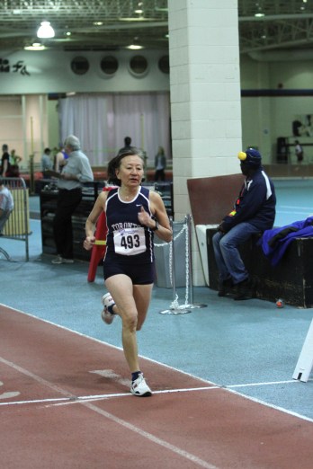 I had hoped to go under 3 minutes and missed by .04 of a second. Boo! I had trouble during the warm-up while jogging with my spikes, as my low-to-the-ground marathoner’s stride sent me sprawling to the ground with my heel toe motion catching the 5mm pins at the wrong time. I was a bundle of nerves, the only thing keeping me going was the knowledge that I would feel a sense of satisfaction afterward and that my leg speed will benefit from my efforts. To help our team garner more points, I also ran the mile which took place an hour later.