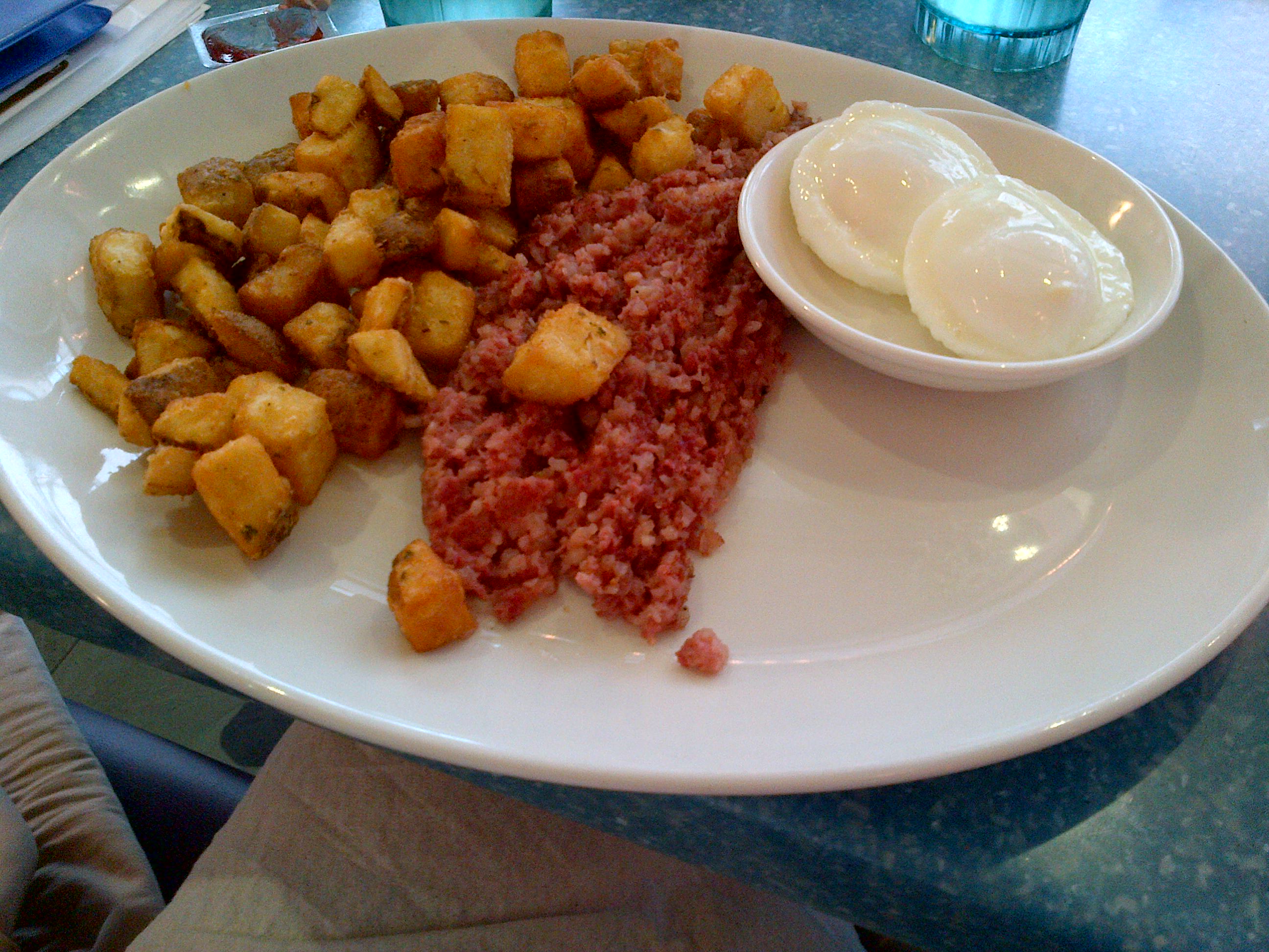 Dropping my mileage in preparation for my last “serious” race of the training cycle on Sunday, June 10th gave me a bit more flexibility to get out and about, and enjoy some good eats. Last Tuesday, I ran earlier than I have for a long while, leaving the house at 5:45 a.m. to run with a friend. This worked out well as I had a 7:30 a.m. breakfast meeting at Fran’s where I was pleased to order a breakfast favourite of mine, corn beef hash.