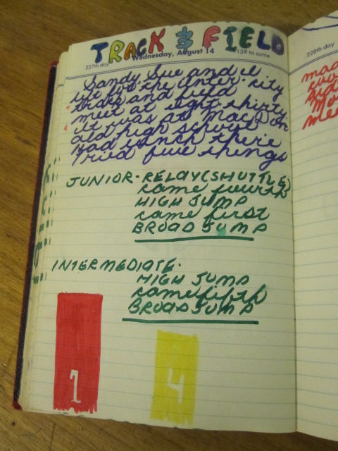 As a child I was not in any way precocious but I was extremely active and involved in all kinds of games and sports.  I had forgotten how so.  In my journal I drew pictures to illustrate my entries including pictures of a new hockey stick, a high jump made by my dad, a baseball bat, a basket player and much more.  I noted, every single occurrence of gym class and all viewings of hockey night in Canada.